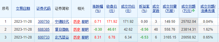 上证报中国证券网讯 据东方财富Choice数据,11月28日A股共70只个股发生大宗交易,总成交18.65亿元,其中宁德时代、复旦微电、北汽蓝谷成交额居前,成交额依次为2.57亿元、2.38亿元、2.01亿元。