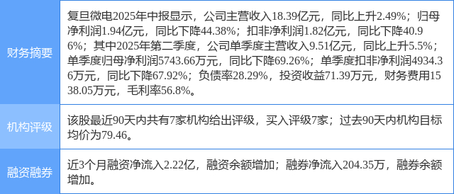 2025年8月29日,民生证券研究员方竞,李少青发布了对复旦微电的研报《2025年半年报点评:FPGA国产领先厂商,FPAI等新产品值得期待》,该研报对复旦微电给出“买入”评级。研报中预计公司25/26/27年归母净利润分别至6.41/10.77/15.05亿元,对应现价PE分别为83/50/36倍,公司是国内领先的IC设计公司,FPGA等高可靠业务国内技术领先,维持“推荐”评级。证券之星数据中心根据近三年发布的研报数据计算,该研报作者对此股的盈利预测准确度为46.85%。