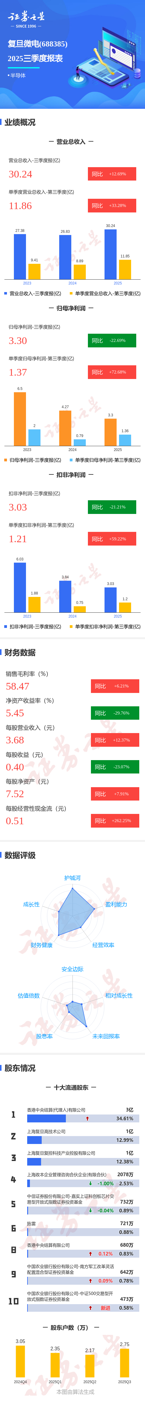 证券之星消息,复旦微电2025年三季报显示,公司主营收入30.24亿元,同比上升12.7%;归母净利润3.3亿元,同比下降22.69%;扣非净利润3.03亿元,同比下降21.21%;其中2025年第三季度,公司单季度主营收入11.86亿元,同比上升33.28%;单季度归母净利润1.37亿元,同比上升72.69%;单季度扣非净利润1.21亿元,同比上升59.22%;负债率26.66%,投资收益1.68万元,财务费用2351.58万元,毛利率58.47%。