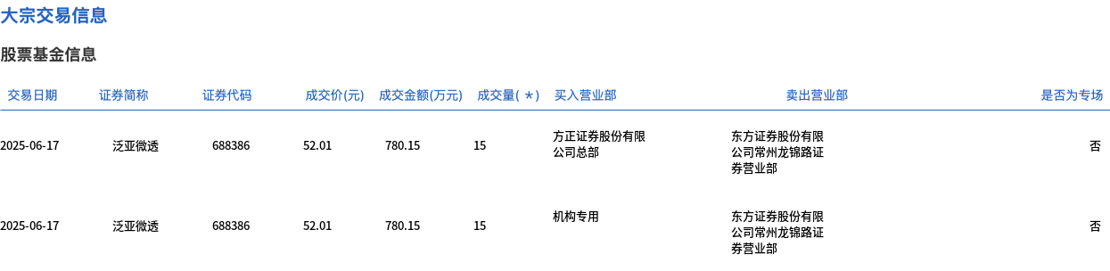泛亚微透今日大宗交易折价成交30万股,成交额1560.3万元
