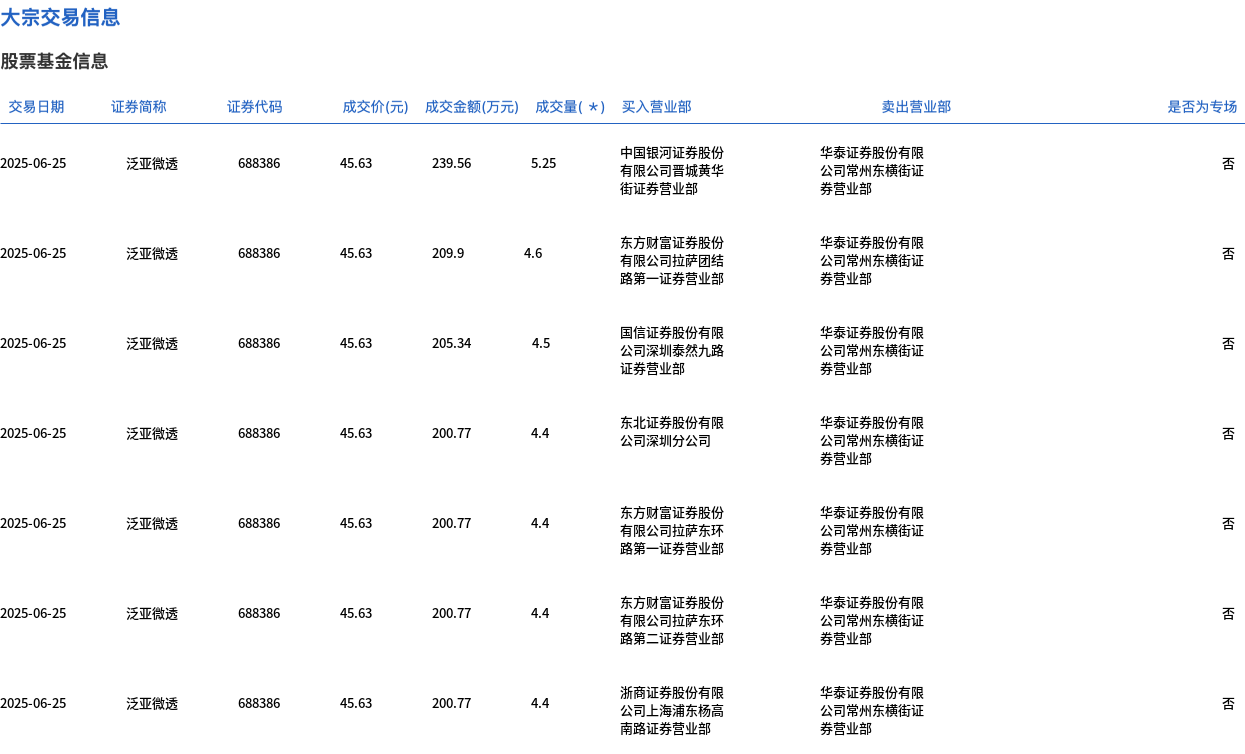 泛亚微透今日大宗交易折价成交31.95万股,成交额1457.88万元