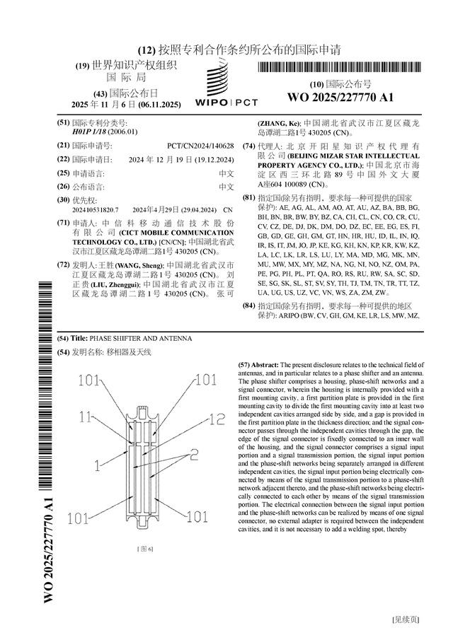 证券之星消息,根据企查查数据显示信科移动(688387)公布了一项国际专利申请,专利名为“移相器及天线”,专利申请号为PCT/CN2024/140628,国际公布日为2025年11月6日。