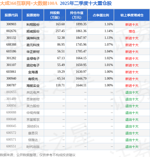 根据2025基金半年报公募基金重仓股数据,重仓该股的公募基金共4家,其中持有数量最多的公募基金为大成基金的大成360互联网+大数据100A。大成360互联网+大数据100A目前规模为6.98亿元,最新净值3.1102(10月14日),较上一交易日下跌1.19%,近一年上涨51.81%。该公募基金现任基金经理为夏高。夏高在任的基金产品包括:大成沪深300增强发起式A,管理时间为2021年2月23日至今,期间收益率为-6.63%;大成动态量化配置策略混合A,管理时间为2023年4月14日至今,期间收益率为11.96%;大成中证500指数增强A,管理时间为2024年7月19日至今,期间收益率为51.71%。