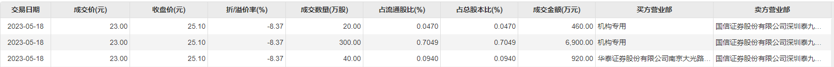 5月18日大宗交易成交360万股,成交额8280万元,占当日总成交额的72.78%,成交价23元,较市场收盘价25.1元折价8.37%。