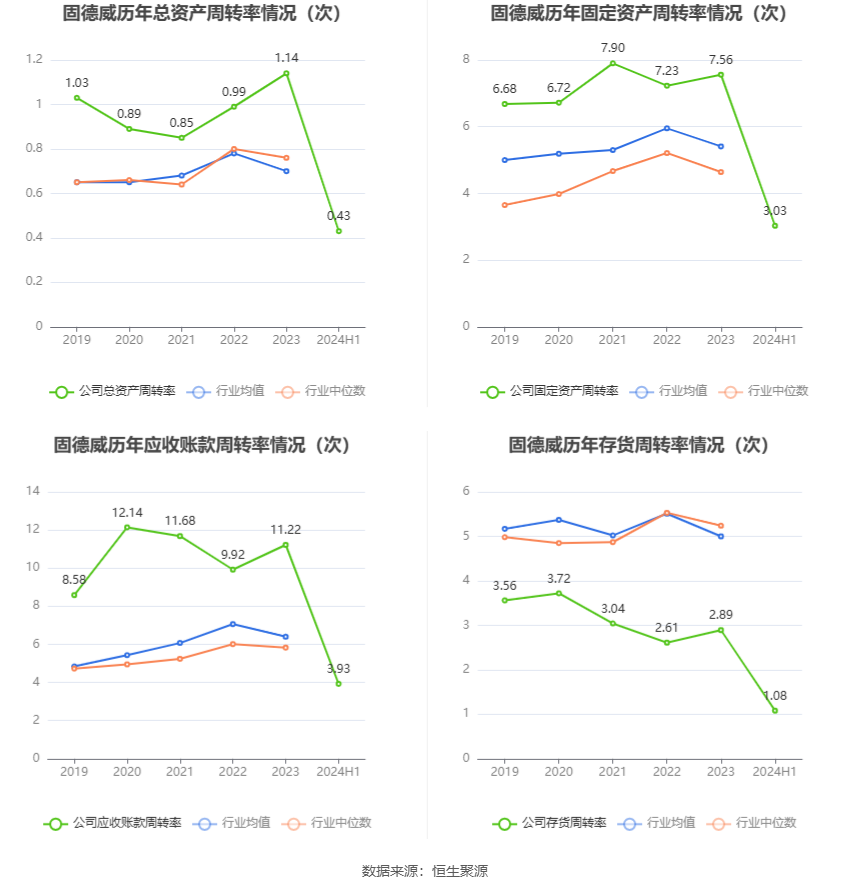 营运能力方面,2024年上半年,公司总资产周转率为0.43次,上年同期为0.59次(2023年上半年行业平均值为0.36次,公司位居同行业9/66);固定资产周转率为3.03次,上年同期为3.99次(2023年上半年行业平均值为2.90次,公司位居同行业22/66);公司应收账款周转率、存货周转率分别为3.93次、1.08次。
