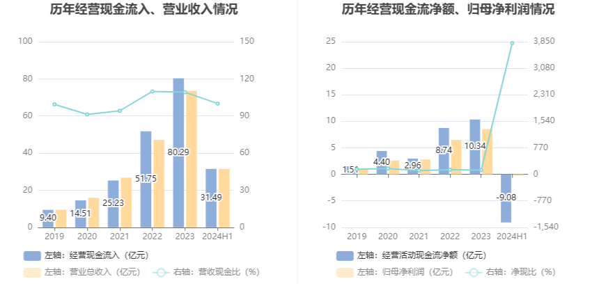 2024年上半年,公司经营活动现金流净额为-9.08亿元,同比减少16.14亿元;筹资活动现金流净额1.66亿元,同比增加3.19亿元;投资活动现金流净额-2.98亿元,上年同期为-3.1亿元。