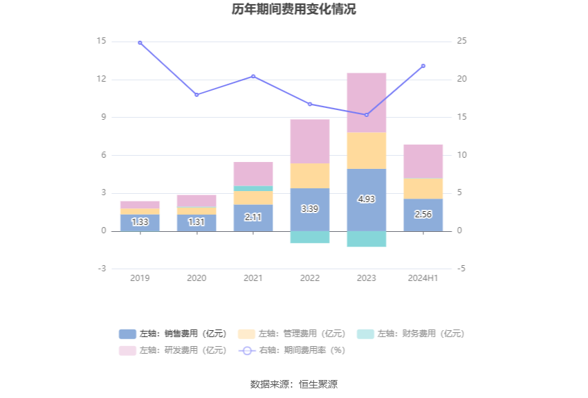 2024年上半年,公司期间费用为6.86亿元,较上年同期增加2.39亿元;期间费用率为21.78%,较上年同期上升10.07个百分点。其中,销售费用同比增长16.47%,管理费用同比增长22.84%,研发费用同比增长23.79%,财务费用由去年同期的-1.19亿元变为334.96万元。
