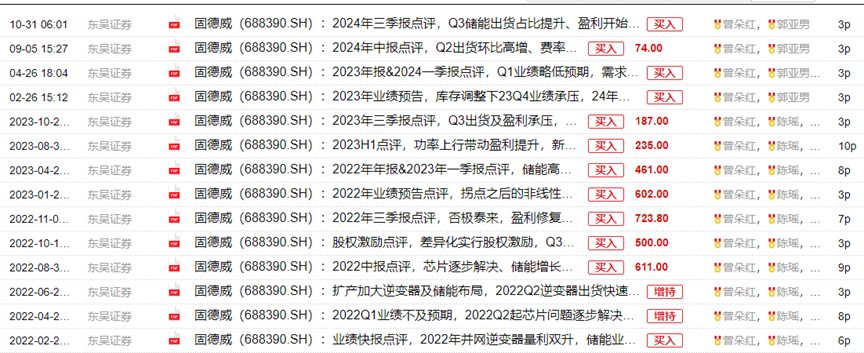 不仅如此,在2023年元旦后的第一个工作日,东吴证券就把固德威的目标价定到了602元,此后一路推荐,一路调低目标价。