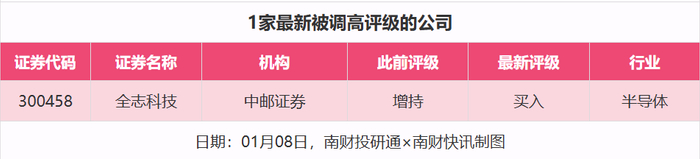 评级调高方面,1月8日,券商调高上市公司评级达到1家次,中邮证券对全志科技的评级从“增持”调高至“买入”。