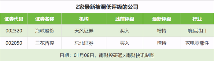 评级调低方面,1月8日,券商调低上市公司评级达到2家次,天风证券对海峡股份的评级从“买入”调低至“增持”,东北证券对三花智控的评级从“买入”调低至“增持”。