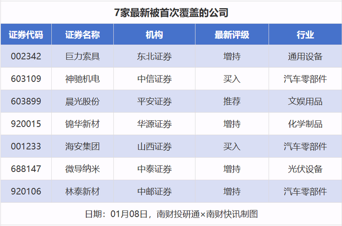 首次覆盖方面,1月8日券商共给出了7次首次覆盖,其中巨力索具获得东北证券给予“增持”评级,神驰机电获得中信证券给予“买入”评级,晨光股份获得平安证券给予“推荐”评级,锦华新材获得华源证券给予“增持”评级,海安集团获得山西证券给予“买入”评级。