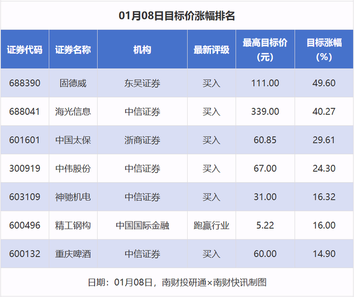 南财投研通数据显示,1月8日,券商给予上市公司目标价共7次,按最新收盘价计算,目标价涨幅排名居前的公司有固德威、海光信息、中国太保,目标价涨幅分别为49.60%、40.27%、29.61%,分别属于光伏设备、半导体、保险行业。