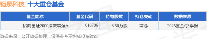 持有钜泉科技最多的基金为招商国证2000指数增强A,目前规模为0.38亿元,最新净值1.5001(10月31日),较上一交易日上涨0.33%,近一年上涨46.56%。该基金现任基金经理为邓童。