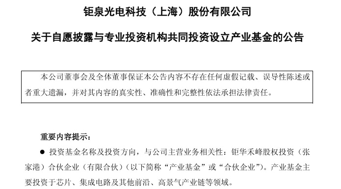 10月29日,钜泉光电科技(上海)股份有限公司(简称“钜泉科技”)发布公告称,其全资子公司鑫聚泉微电子(上海)有限公司计划以自有资金出资1.5亿元人民币,作为有限合伙人参与设立一只产业基金。该基金已完成工商登记,名称为“钜华禾峰股权投资(张家港)合伙企业(有限合伙)”。在完成出资后,鑫聚泉将持有基金首次认缴出资总额的99.93%合伙份额。