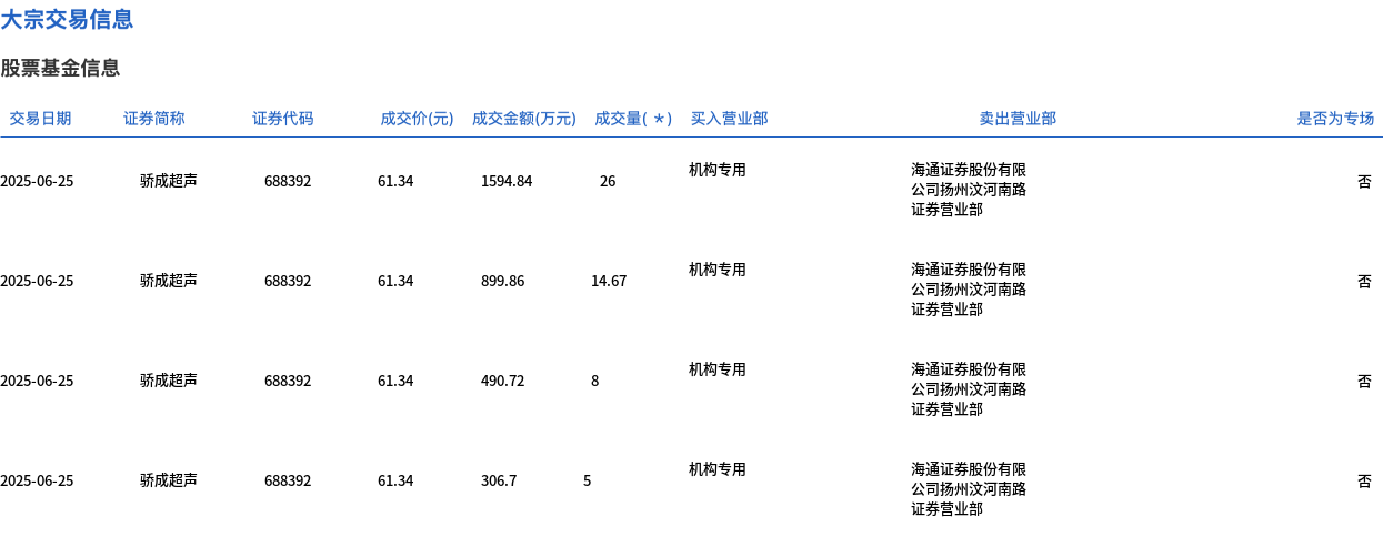 骄成超声今日大宗交易折价成交53.67万股,成交额3292.12万元