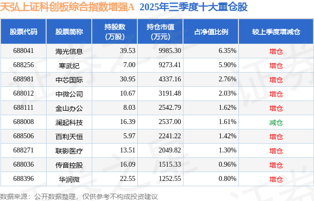 根据2025基金Q3季报公募基金重仓股数据,重仓该股的公募基金共6家,其中持有数量最多的公募基金为天弘基金的天弘上证科创板综合指数增强A。天弘上证科创板综合指数增强A目前规模为11.12亿元,最新净值1.3371(12月2日),较上一交易日下跌1.33%。该公募基金现任基金经理为林心龙。林心龙在任的基金产品包括:天弘创业板ETF联接A,管理时间为2022年5月25日至今,期间收益率为35.61%;天弘中证计算机ETF联接A,管理时间为2022年5月25日至今,期间收益率为40.14%;天弘创业板ETF,管理时间为2022年5月25日至今,期间收益率为36.99%;天弘中证计算机ETF,管理时间为2022年5月25日至今,期间收益率为43.28%。