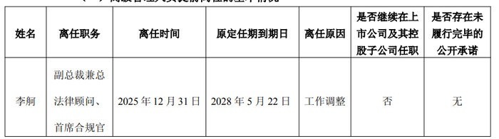 李舸离任时间是 2025 年 12 月 31 日,原定任期到期日为 2028 年 5 月 22 日,离任原因是工作调整,不再继续在上市公司及其控股子公司任职,不存在未履行完毕的公开承诺。