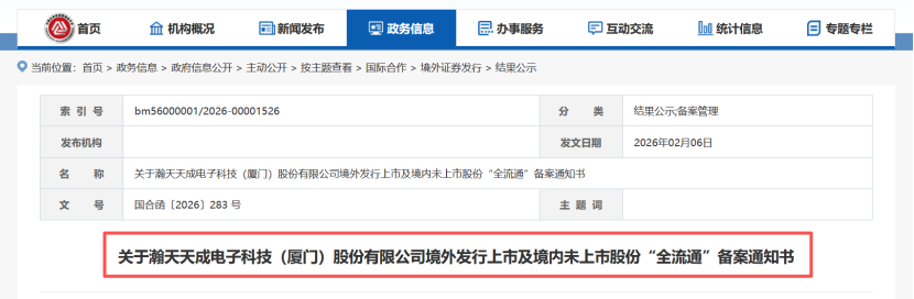 近日,中国证监会官网正式发布《瀚天天成电子科技(厦门)股份有限公司境外发行上市及境内未上市股份“全流通”备案通知书》,意味着瀚天天成赴港上市已完成境内监管层面关键前置程序,即将进入港交所聆讯与挂牌流程。