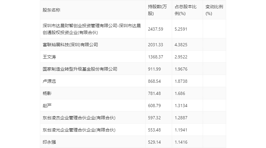 一季报显示,2024年一季度末公司十大流通股东中,持股最多的为深圳市达晨财智创业投资管理有限公司-深圳市达晨创通股权投资企业(有限合伙),占比5.26%。十大流通股东名单相比2023年年报维持不变。在具体持股比例上,东台凌光企业管理合伙企业(有限合伙)持股有所上升。