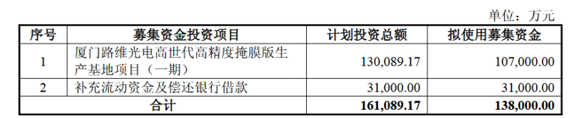 项目分阶段实施,本次募集资金投资项目为“厦门路维光电高世代高精度掩膜版生产基地项目(一期)”,预计建设周期为33个月,计划总投资13.01亿元,其中拟投入募集资金10.70亿元。