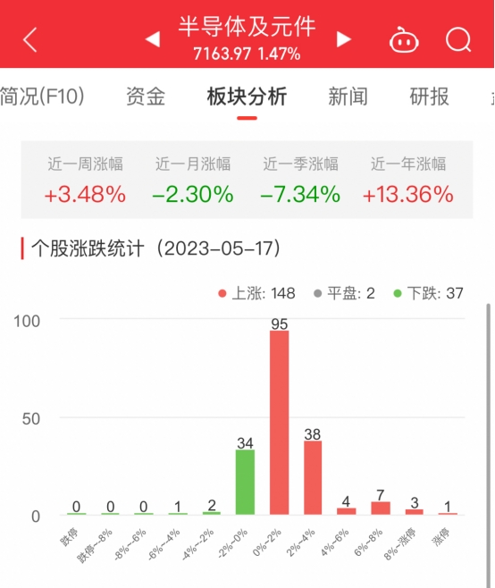 中国经济网北京5月17日讯今日,半导体及元件板块整体涨幅1.47%,其中148只股票上涨,2只股票平盘,37只股票下跌。