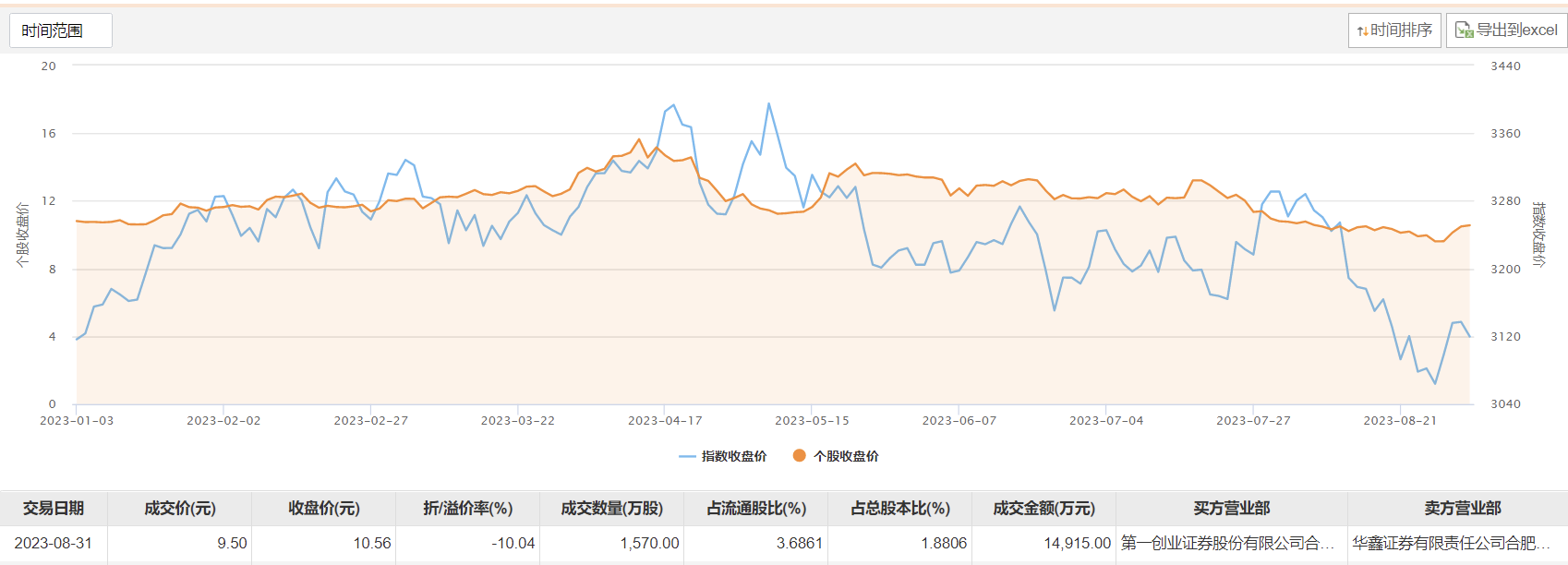 今日大宗交易成交1570万股,成交额1.49亿元,占当日总成交额的53.86%,成交价9.5元,较市场收盘价折价10.04%。