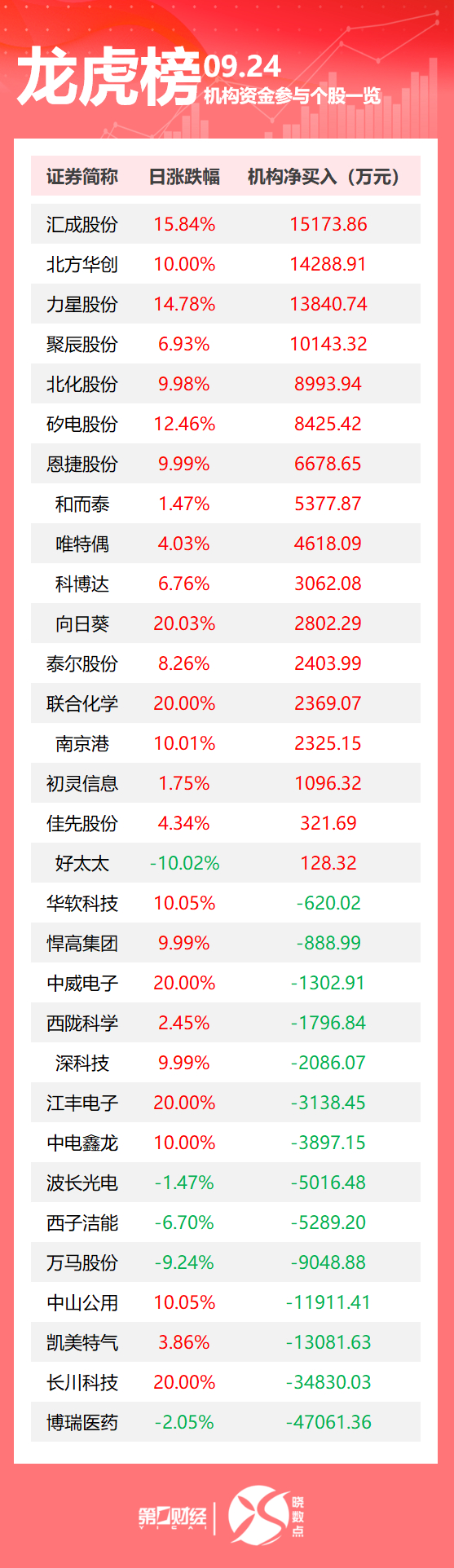 当天机构净买入前三的股票分别是汇成股份、北方华创、力星股份,净买入金额分别是1.52亿元、1.43亿元、1.38亿元。