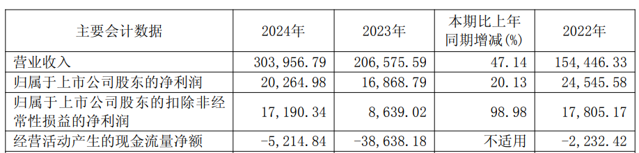 2024年,公司实现营业收入30.40亿元,同比增长47.14%;归属于上市公司股东的净利润2.03亿元,同比增长20.13%;归属于上市公司股东的扣非净利润1.72亿元,同比增长98.98%;经营活动产生的现金流量净额为-5214.84万元,上年同期为-3.86亿元。