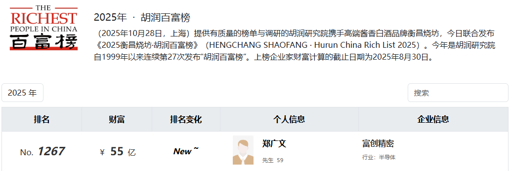 值得一提的是,2025年,郑广文以55亿元财富位列胡润百富榜第1267位。该榜单计算的截止日期为2025年8月30日。