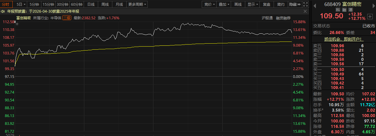 截至今日(2月25日)收盘,富创精密报价109.50元,涨幅达12.71%,市值达335.30亿元。与此同时,和林微纳、有研硅收20CM涨停,江丰电子、中船特气涨幅超10%,拓荆科技、赛微微电、长光华芯等跟涨。