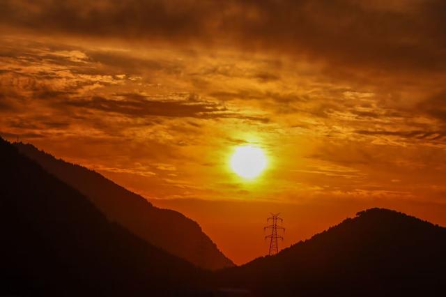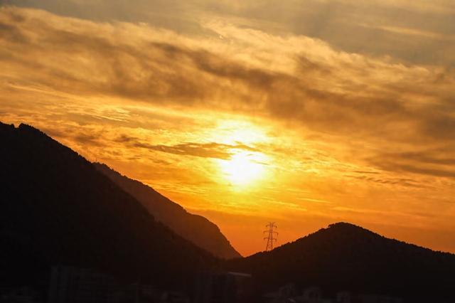 11月13日,济南黄昏时分,群山之外,夕阳晚归,五彩云霞映红天际,充满诗情画意。(大众日报客户端记者 武宗义 报道)