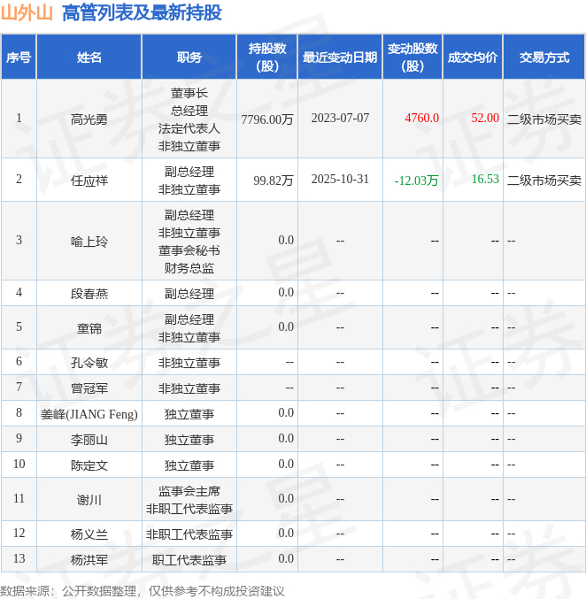 山外山近半年内的董监高及核心技术人员增减持详情如下: