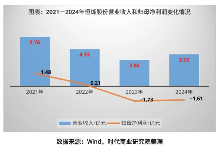 财报显示,2021—2024年,恒烁股份的营业收入分别为5.76亿元、4.33亿元、3.06亿元、3.72亿元,其中2022—2023年分别同比下滑24.76%、29.41%;盈利端表现更差,同期归母净利润分别为1.48亿元、0.21亿元、-1.73亿元、-1.61亿元,其中2023—2024年连续两年出现过亿元的亏损。