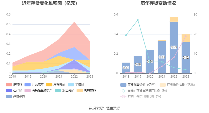 从存货变动来看,截至2023年年末,公司存货账面价值为3204.18万元,占净资产的1.93%,较上年末减少2048.42万元。其中,存货跌价准备为754.51万元,计提比例为19.06%。