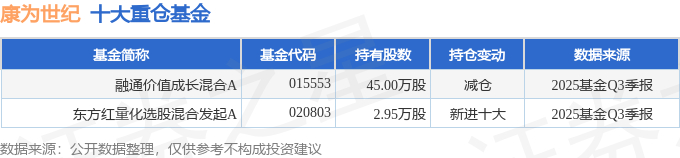 持有康为世纪最多的基金为融通价值成长混合A,目前规模为1.9亿元,最新净值1.256(10月31日),较上一交易日上涨0.88%,近一年上涨25.1%。该基金现任基金经理为万民远。