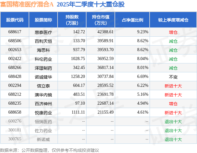 根据2025基金半年报公募基金重仓股数据,重仓该股的公募基金共44家,其中持有数量最多的公募基金为富国基金的富国精准医疗混合A。富国精准医疗混合A目前规模为36.45亿元,最新净值3.4638(10月9日),较上一交易日下跌2.27%,近一年上涨39.55%。该公募基金现任基金经理为赵伟。赵伟在任的基金产品包括:富国核心趋势混合A,管理时间为2023年5月16日至今,期间收益率为65.81%;富国医药创新股票A,管理时间为2024年3月12日至今,期间收益率为91.5%;富国科创板两年定开混合,管理时间为2024年4月23日至今,期间收益率为88.66%。