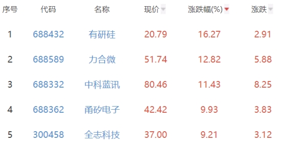 其中,有研硅、力合微、中科蓝讯、甬矽电子、全志科技位列板块涨幅前五位,涨幅分别为16.27%、12.82%、11.43%、9.93%、9.21%。