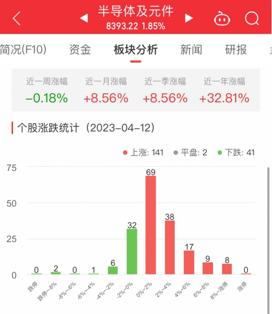 中国经济网北京4月12日讯今日,半导体及元件板块整体涨幅1.85%,其中141只股票上涨,2只股票平盘,41只股票下跌。