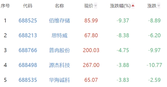 佰维存储、思特威、普冉股份、源杰科技、华海诚科位列涨幅榜后五位,涨幅分别为-9.37%、-8.38%、-4.75%、-3.88%、-3.83%。