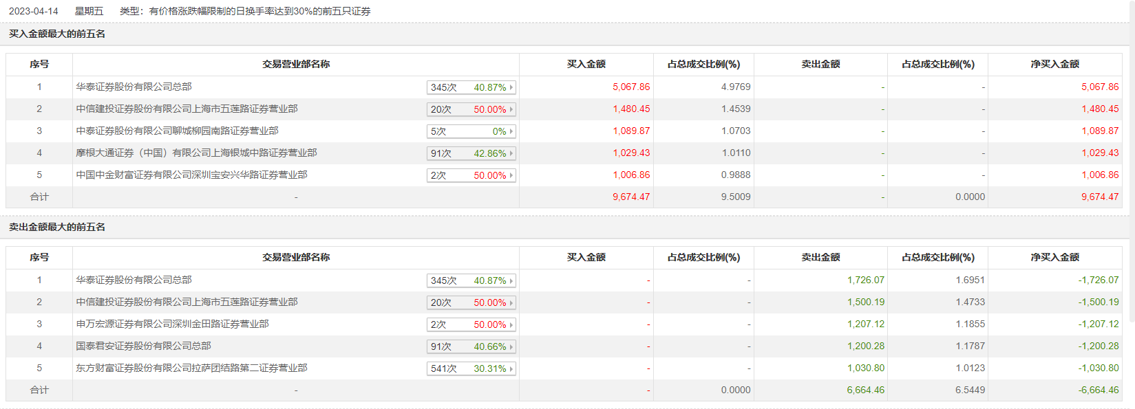 具体来看,华泰证券总部、中信建投证券上海市五莲路证券营业部分别买入5067.86万元、1480.45万元;华泰证券总部、中信建投证券上海市五莲路证券营业部分别卖出1726.07万元、1500.19万元。