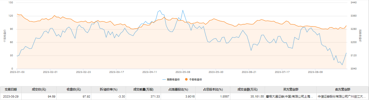 8月29日大宗交易成交371.33万股,成交额3.52亿元,占当日总成交额的72.82%,成交价94.69元,较市场收盘价97.92元折价3.3%。