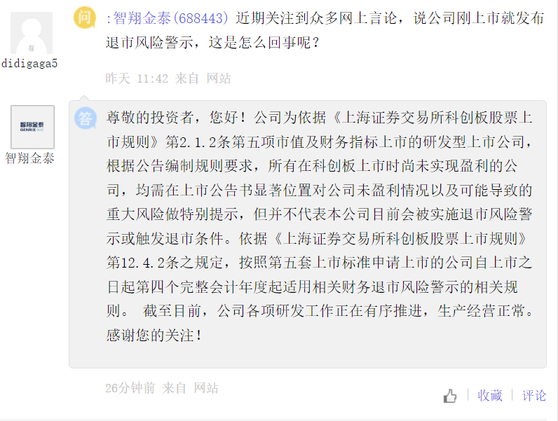 中国网财经6月29日讯(记者苏楠 叶浅)据“上证e互动”消息,昨日午间,有投资者表示,近期关注到众多网上言论,称公司刚上市即发布退市风险警示,并问及事件详情。中国网财经记者注意到,今日早间,智翔金泰回应上述提问。