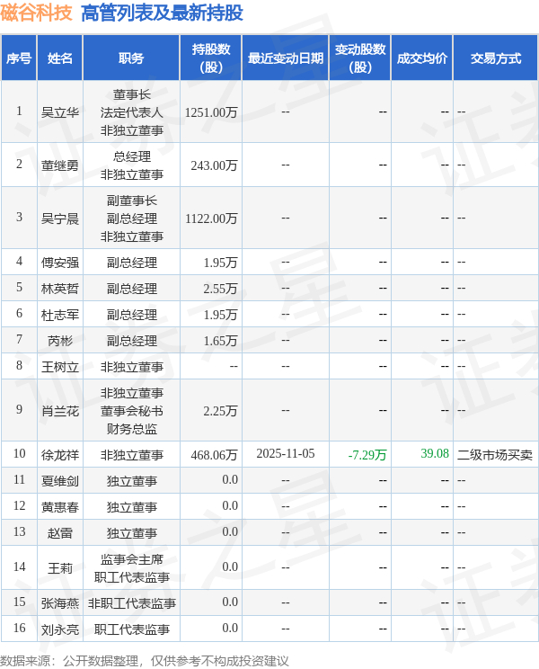 磁谷科技近半年内的董监高及核心技术人员增减持详情如下: