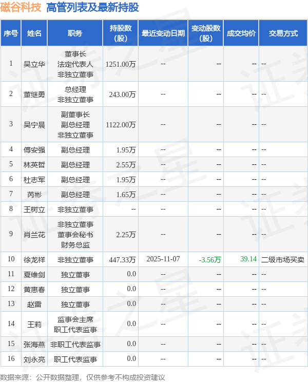 磁谷科技的高管列表及最新持股情况如下:
