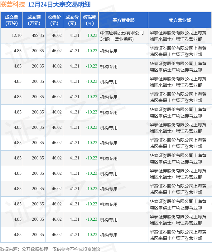 12月24日联芸科技现14笔折价10.23%的大宗交易 合计成交3104.4万元