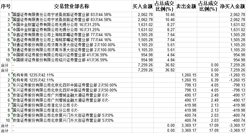 其中,机构合计净卖出1260.15万元。此外,宁波桑田路(国盛证券宁波桑田路证券营业部)、中国中金财富证券有限公司无锡分公司分别买入2062.78万元、1631.02万元;东兴证券北京北四环中路证券营业部、安信证券广州增城金融大道证券营业部分别卖出798.13万元、490.17万元。