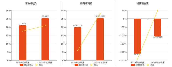 公司营业总收入为28.49亿元,在已披露的同业公司中排名第11,较去年同报告期营业总收入增加4.91亿元,实现2年连续上涨,同比较去年同期上涨20.80%。归母净利润为5166.22万元,较去年同报告期归母净利润增加1130.11万元,实现2年连续上涨,同比较去年同期上涨28.00%。经营活动现金净流入为-8172.93万元,较去年同报告期经营活动现金净流入增加7865.57万元。