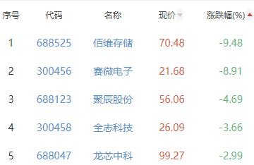 佰维存储、赛微电子、聚辰股份、全志科技、龙芯中科位列涨幅榜后五位,涨幅分别为-9.48%、-8.91%、-4.69%、-3.66%、-2.99%。
