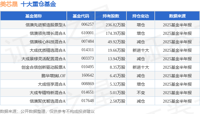 持有美芯晟最多的基金为信澳先进智造股票型A,目前规模为13.65亿元,最新净值2.4229(10月21日),较上一交易日上涨2.0%,近一年上涨52.25%。该基金现任基金经理为齐兴方。