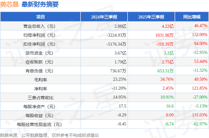 美芯晟(688458)2025年三季报简析:营收净利润同比双双增长,盈利能力上升